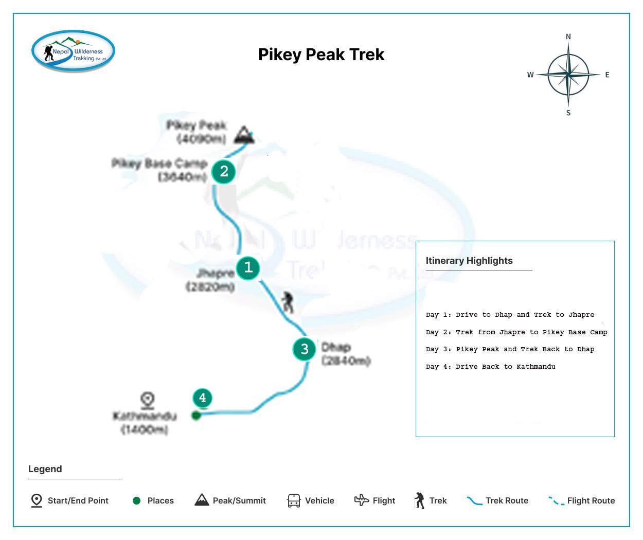 • Day 3: Sunrise at Pikey Peak (4,065m) and Trek Back to Dhap Summit Trek: 1-2 hours, 4 km (round trip), ascent of 425m and descent of 425m Return Trek: 6-7 hours, 12 km, descent of 790m