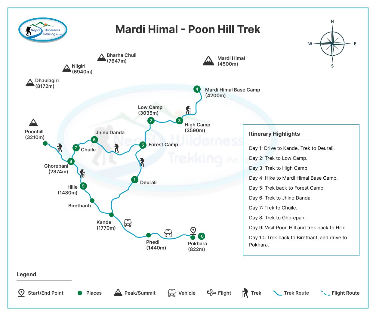 Further, the Classic Mardi Himal vs Poon Hill Trek begins from Pokhara to Naudanda Kande Drive, and from Kande, hikes to the Australian camp, which is the trail of the Annapurna Base Camp highway trekking path. it is the nearest trek to the tourist hub of Pokhara. 10 days poon hill trek via Mardi classic route covers Pitam Deurali, Badal Danda, Mardi base camp, Landruk village, Hot spring Jhinu Danda, Tadapani, and Poonhill.