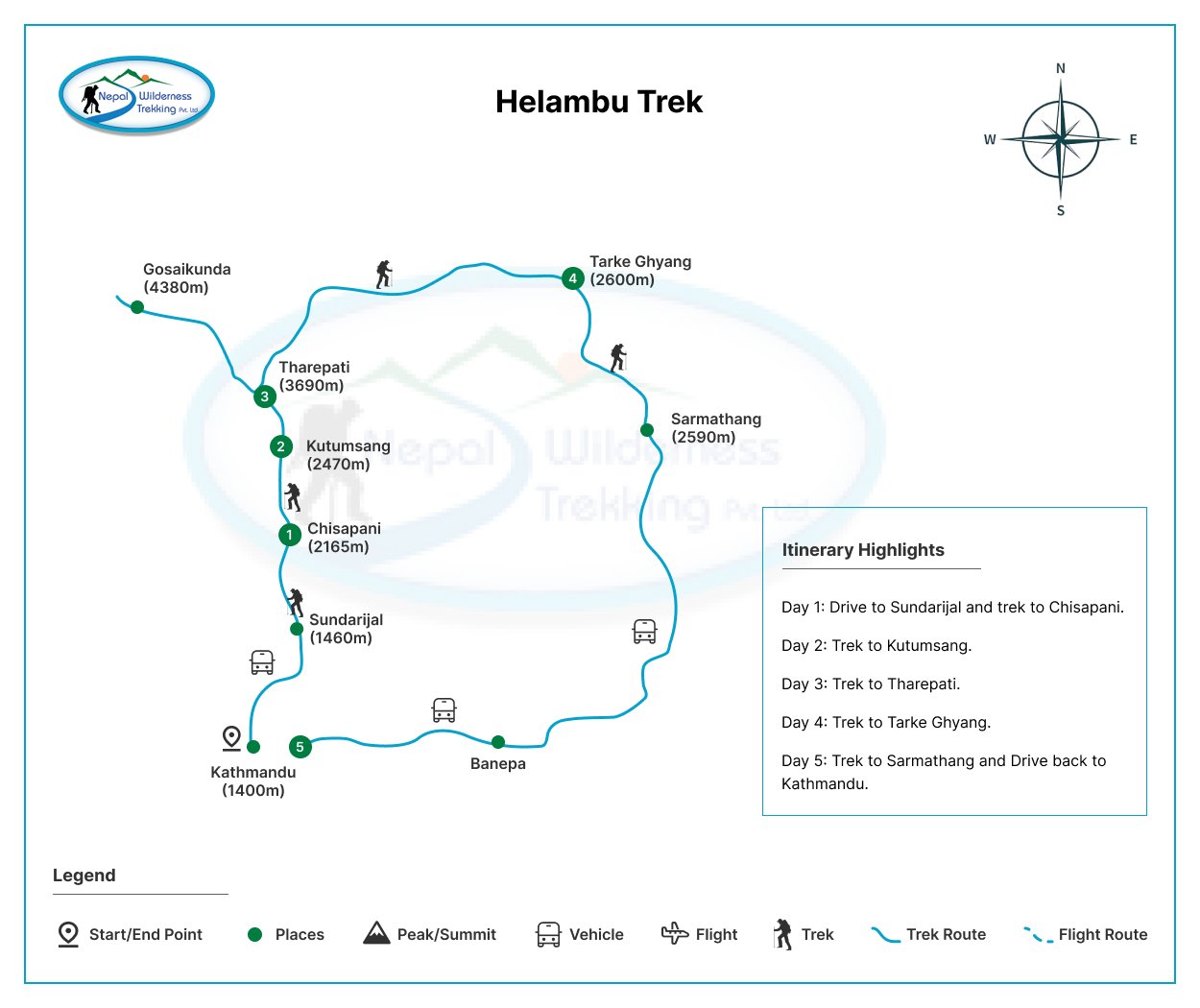 The Helambu Trek typically spans five days, covering a distance of approximately 80 kilometers. The adventure commences with a scenic drive from Kathmandu to Sundarijal, where you will begin your trek. Traverse through dense mountain forests, beautiful rice fields, and charming villages along the way. Ascend to Chisapani, where you can marvel at the stunning views and immerse yourself in the local culture. Journey onward to Kutumsang, Thadepati, Tarke Ghyang, and finally, Sermanthang. Each stop along the way offers unique cultural experiences and breathtaking vistas, creating cherished memories to last a lifetime.