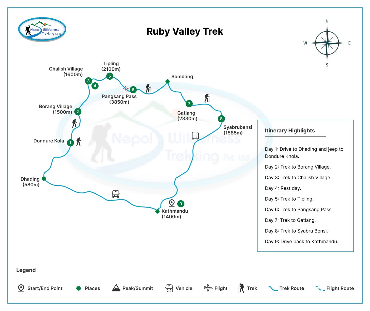 The Ruby Valley trek itinerary typically spans over 9 days and begins from Dundur Khola, following a scenic bus ride from Kathmandu to Dhading Besi, and then a Tata Sumo Jeep ride from Dhading Besi. It is worth noting that the trek can also be done in reverse, starting from Syabrubesi and trekking through Somdang, Tipling, Chalish, and finally descending to Dhading Besi or Tirsuli via Singla pass
