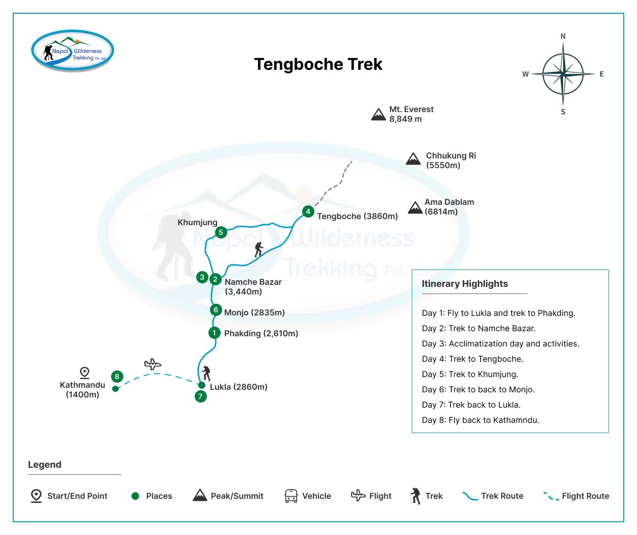 The Lukla to Tengboche Trek is an 8-day walk, with a highlight overnight stay at Tengboche (3,860m), while Lukla to EBC takes 12 days. The segment from Namche Bazaar to Tengboche is approximately 11 km (6.8 miles), and takes about 5–6 hours. This scenic section ascends through pine forests and ridgelines with mesmerizing views.