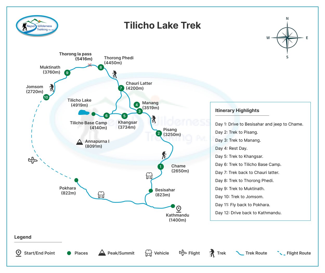 After crossing the Thorang La pass, the Tilicho Lake Trek culminates in Jomsom’s 2,720-meter altitude. From here, trekkers can choose to fly to Pokhara or take a bus, depending on the weather conditions. For those with additional time, the trek can be extended to visit Tatopani and Ghorepani Poon Hill, at 3,210 meters, allowing for further exploration of the region’s beauty.